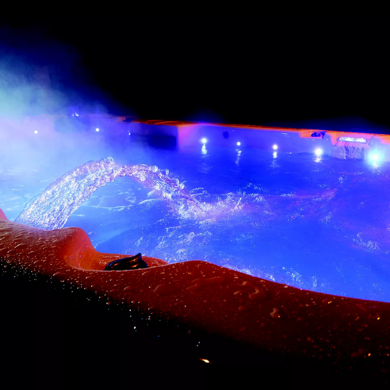 - 7 hydro-massage seats including 1 step/higher elevation seat, 1 stand up massage seat, 1 no-float lay down seat, a 10ft dedicated swim area capable of accommodating 8 more bathers/1 active swimmer and 71 powerful jets including 5 high current swim jets for a great massage and strong swim