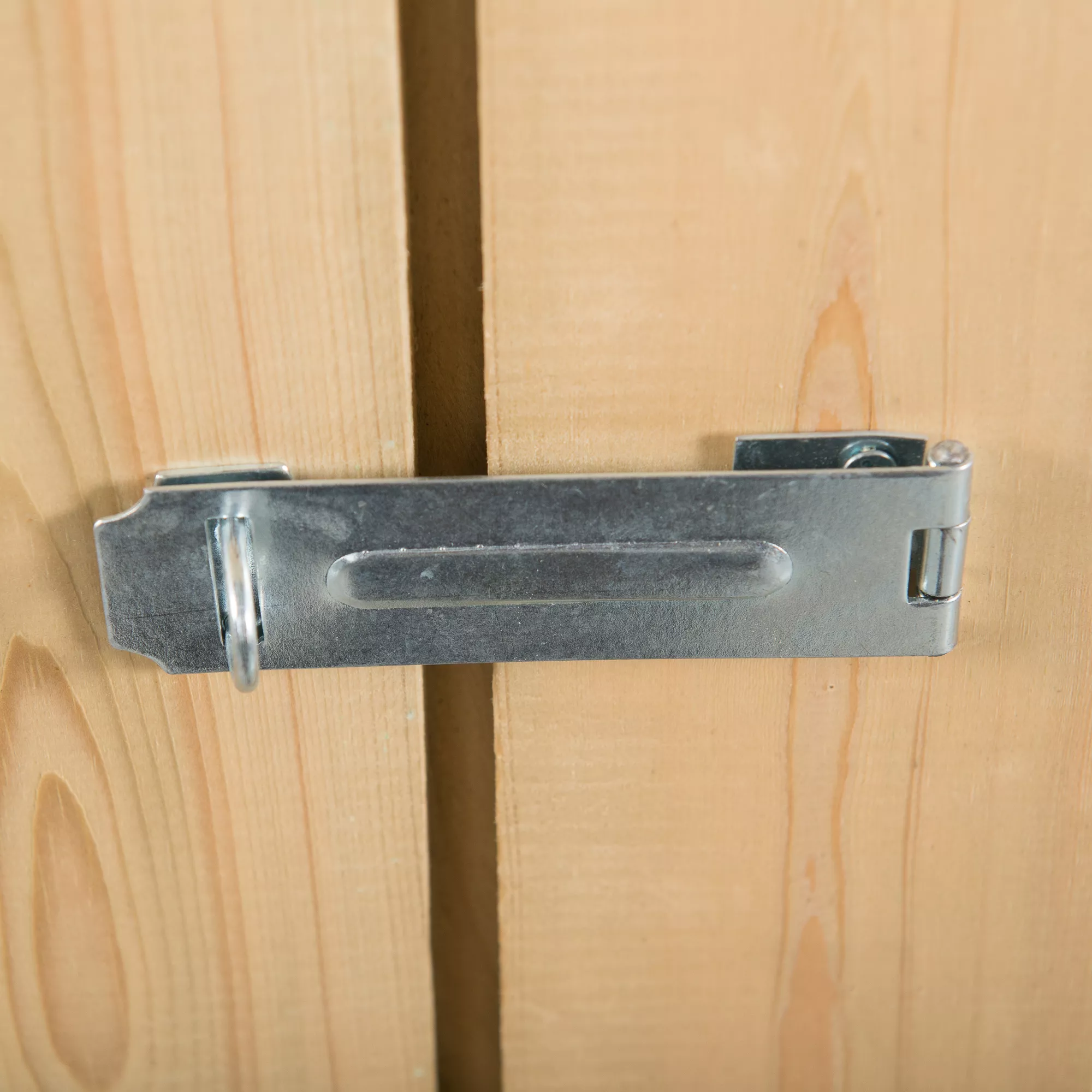- Plate hasp and staple latch for use with a padlock (not included) and hidden door hinges for added security