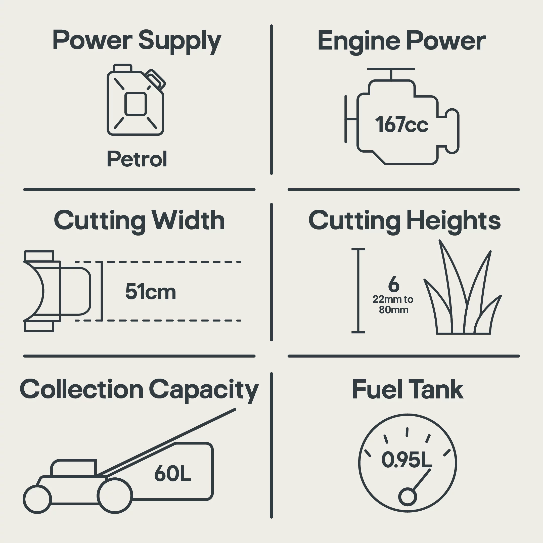 - Rugged powder coated and hard wearing steel chassis with 51cm cutting width